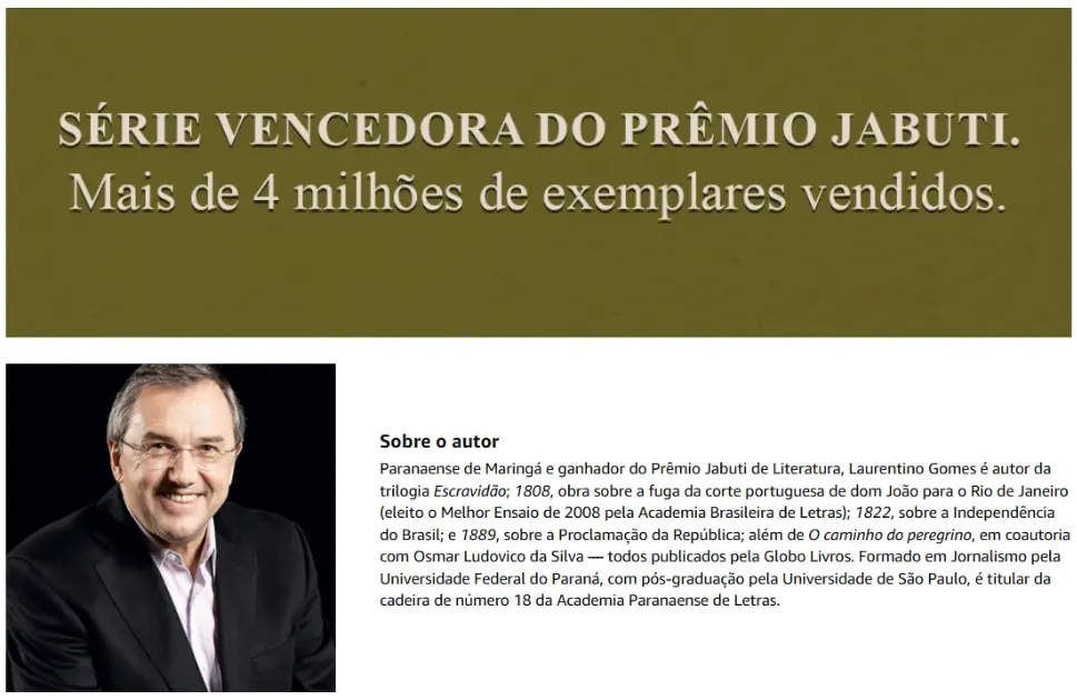 Paranaense de Maringá e seis vezes ganhador do Prêmio Jabuti de Literatura, Laurentino Gomes é autor de 1808, obra sobre a fuga da corte portuguesa de dom João para o Rio de Janeiro (eleito o Melhor Ensaio de 2008 pela Academia Brasileira de Letras); 1822, sobre a Independência do Brasil; e 1889, sobre a Proclamação da República; além de O caminho do peregrino, em coautoria com Osmar Ludovico da Silva — todos publicados pela Globo Livros. Formado em Jornalismo pela Universidade Federal do Paraná, com pós-graduação pela Universidade de São Paulo, é titular da cadeira de número 18 da Academia Paranaense de Letras.