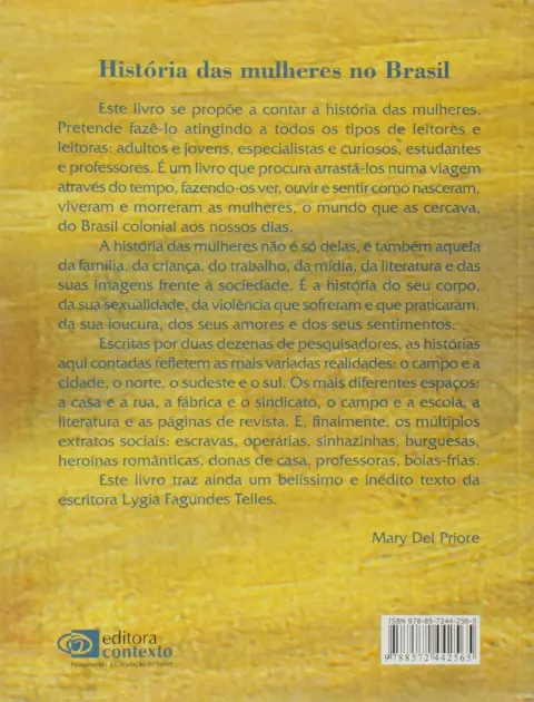 Conta a trajetória das mulheres, do Brasil colonial a nossos dias, voltando-se a todos os tipos de leitores e leitoras: adultos e jovens, especialistas e curiosos, estudantes e professores, arrastando-os numa viagem através dos tempos. Obra organizada por Mary Del Priore – da qual participam duas dezenas de historiadores além da consagrada escritora Lygia Fagundes Telles – mostra como nasciam, viviam e morriam as brasileiras no passado e o mundo material e simbólico que as cercavam. Percebendo a história das mulheres como algo que envolve também a história das famílias, do trabalho, da mídia, da literatura, da sexualidade, da violência, dos sentimentos e das representações, o livro abarca os mais diferentes espaços (campo e cidade, norte e sul do país) e extratos sociais (escravas, operárias, sinhazinhas, burguesas, donas de casa, professoras, bóias-frias). Também não se contenta em apenas de separar as vitórias e as derrotas das mulheres, mas derruba mitos, encoraja debates, estimula a reflexão e coloca a questão feminina na ordem do dia. Sucesso de público e de crítica, HISTÓRIA DAS MULHERES NO BRASIL já chegou a 20 mil exemplares vendidos, além de ter ganho os prestigiados prêmios Jabuti e Casa Grande e Senzala.