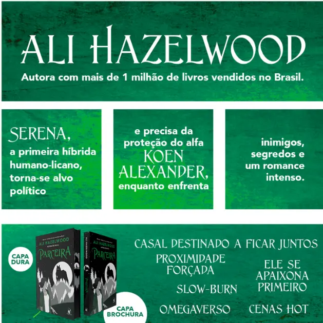 ALI HAZELWOOD é autora de comédias românticas em que as protagonistas são mulheres das áreas de ciências, tecnologia, engenharia e matemática. Ph.D. em neurociência, ela também tem vários artigos publicados – nos quais, infelizmente, ninguém dá uns amassos e o “para sempre” nem sempre é feliz. Nascida na Itália, ela morou na Alemanha e no Japão antes de se mudar para os Estados Unidos. Quando não está no trabalho, Ali pode ser encontrada correndo, fazendo crochê, comendo doces ou assistindo a filmes de ficção científica com seus dois soberanos felinos (e o marido um pouco menos felino).