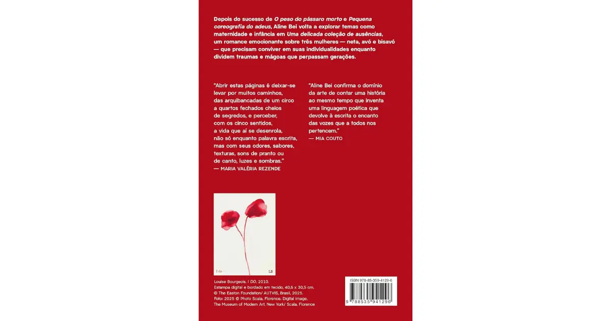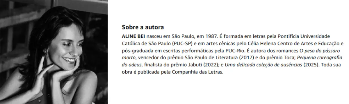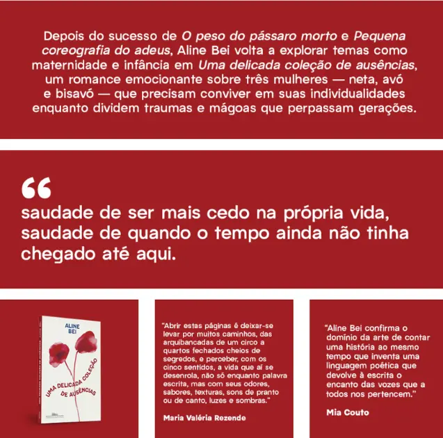 Depois do sucesso de O peso do pássaro morto e Pequena coreografia do adeus, Aline Bei volta a explorar temas como maternidade e infância em Uma delicada coleção de ausências, um romance emocionante sobre três mulheres ― neta, avó e bisavó ― que precisam conviver em suas individualidades enquanto dividem traumas e mágoas que perpassam gerações.
